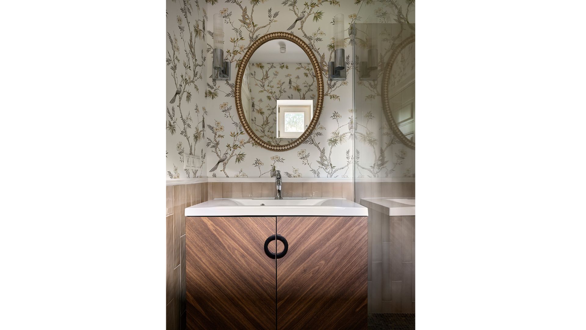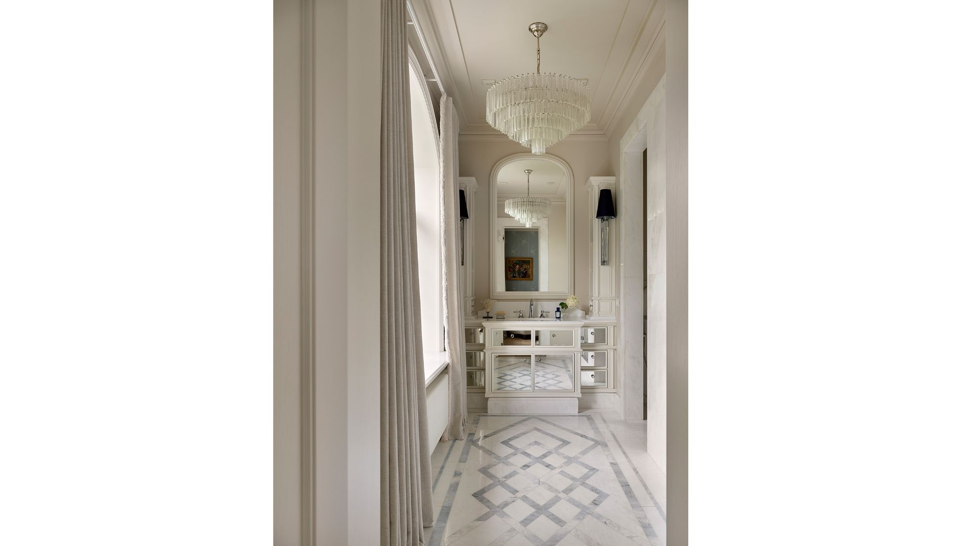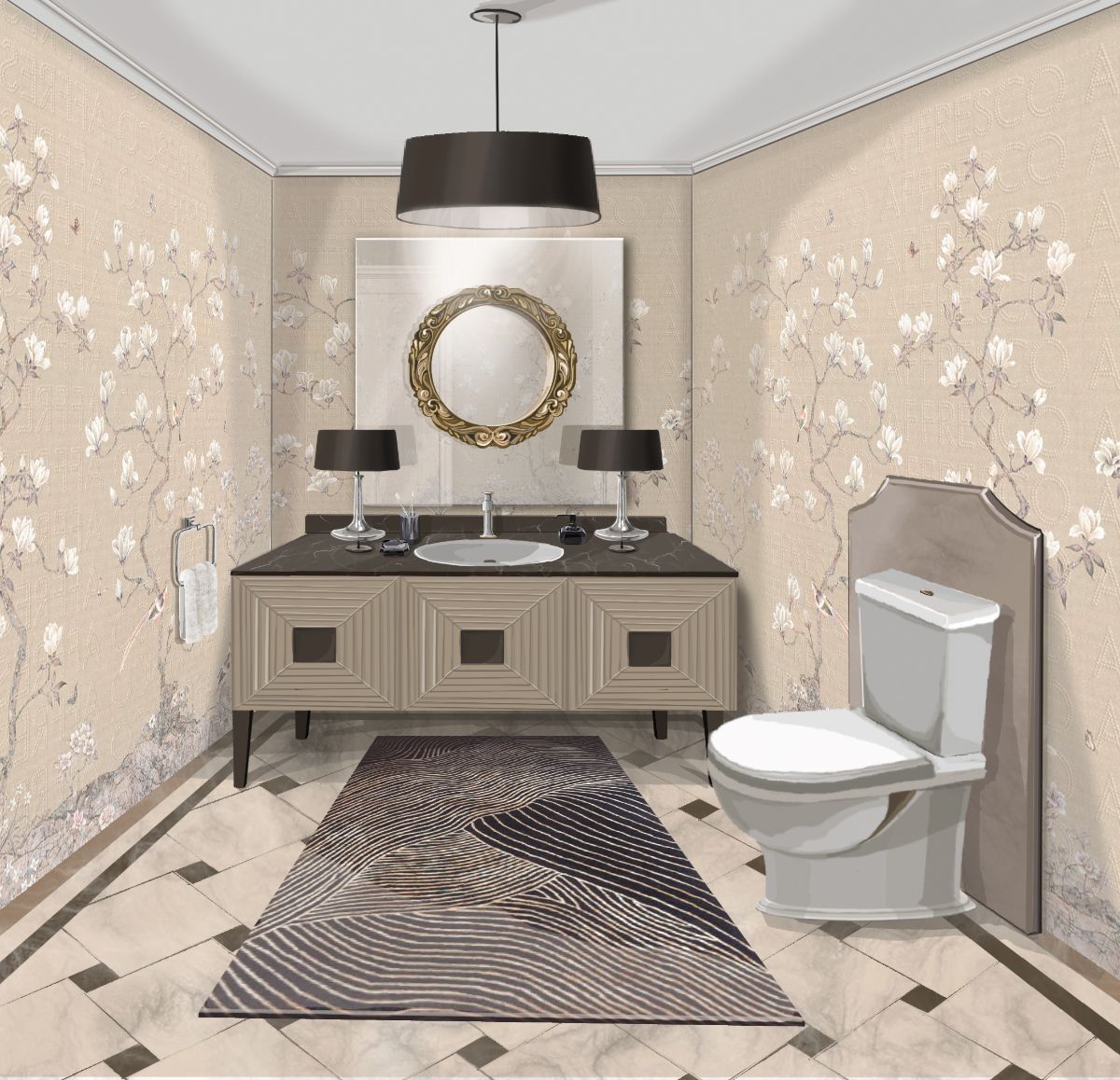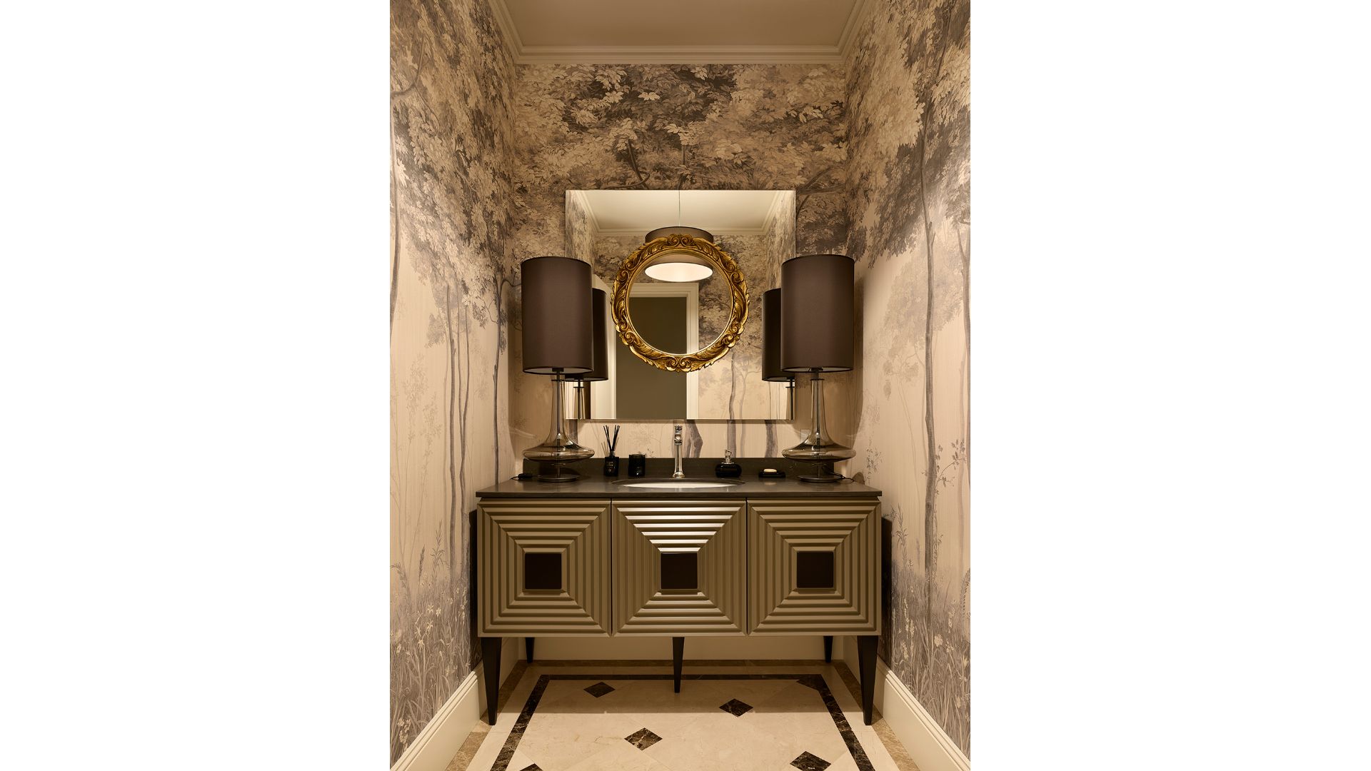 Многоуровневый свет: акцент на декоративные элементы Освещение играет ключевую роль в создании атмосферы этого дома. Мы использовали разнообразные источники света — от люстр и торшеров до бра и настольных ламп, чтобы эффектно выделить определенные зоны и создать уютный настрой в них. Так в гостевой ванной мы драматично приглушили свет. При этом намеренно поставили огромные лампы с темными абажурами, которые дают эффектные отблески, и на стены с крупным орнаментом (обои), и на зеркало. Для этого нам пришлось избавится от бра в пользу этих ламп и обратить внимание на нестандартное зеркало с багетом … такой театральный прием : масштабные вещи, отражение и драма света.